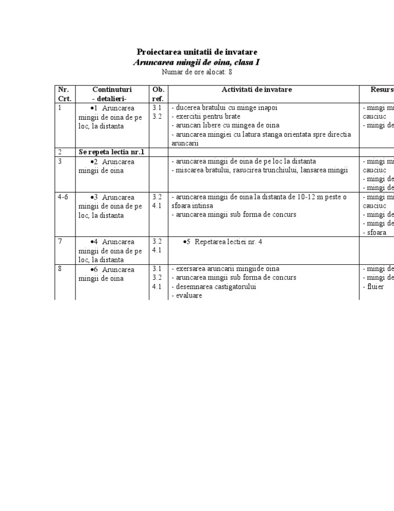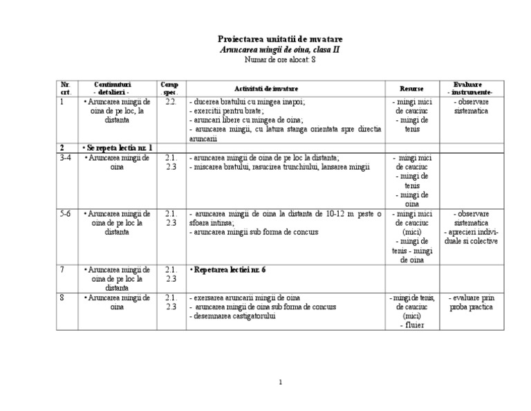 Plan Lectie Cl 1 Aruncarea Mingii De Oina