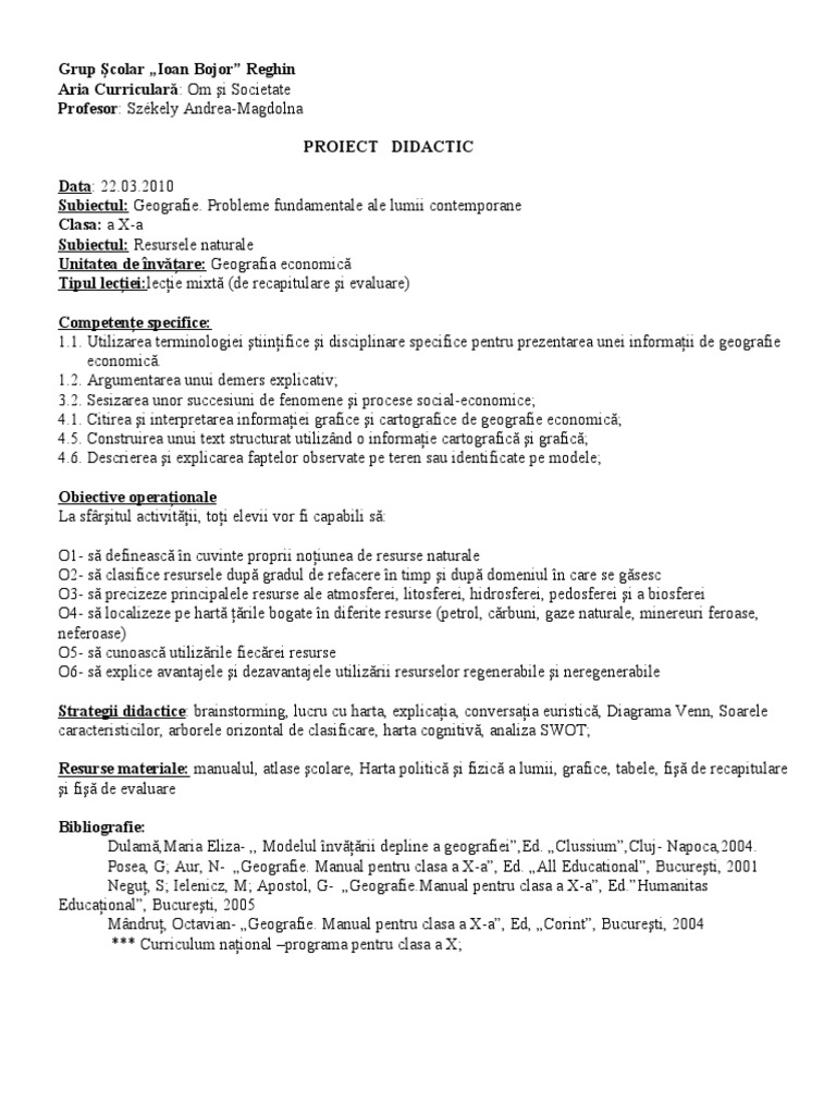 Proiect Plan De Lectie Stiinte Ale Naturii Resursele Naturale Pedagogie 380367