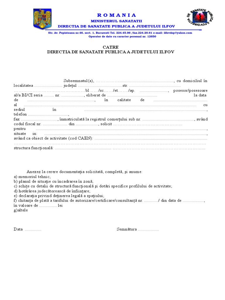 Cerere solicitant care sa cuprinda domiciliu solicitantului sediul firmei cod fiscal banca cont banca adresa amplasament. R o m a n i aministerul sanatatiidirectia de sanatate publica a judetului ilfovstr. Harta directiilor de sanatate publica din romania alba arad argeș bacău bihor bistrița năsăud botoșani brașov brăila bucurești buzău caraș severin călărași cluj constanța covasna dâmbovița dolj galați giurgiu gorj harghita hunedoara ialomița iași ilfov maramureș mehedinți mureș neamț olt prahova satu mare sălaj sibiu suceava teleorman timiș tulcea vaslui vâlcea vrancea. Documente necesare aviz sanatate publica bucuresti ilfov si in tara cerere tip date de contact taxa aviz sanatate acte necesare pentru obtinerea avizului pentru sanatatea publica.