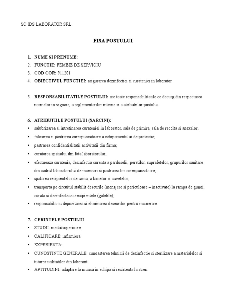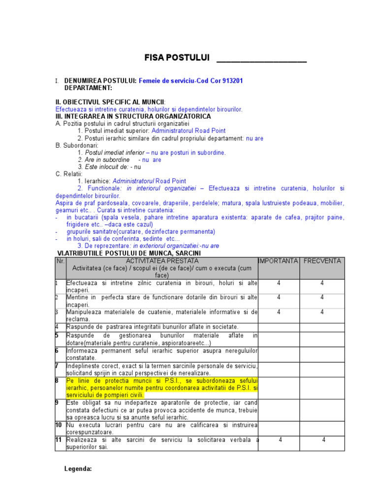 Fisa Postului Femeie De Serviciu Cod Cor 913201