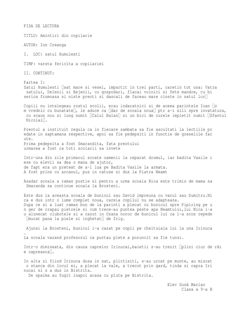 Fisa De Lectura Amintiri Din Copilarie