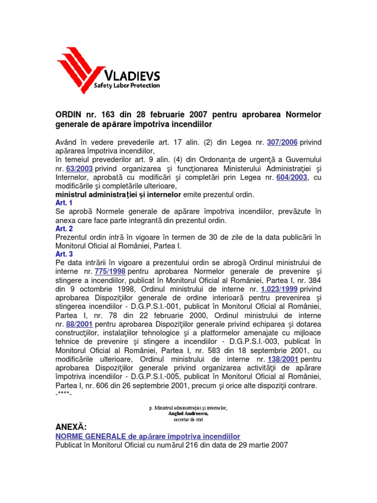 O M A I 163 Din 2007 Norme Generale Aparare Impotriva Incendiilor