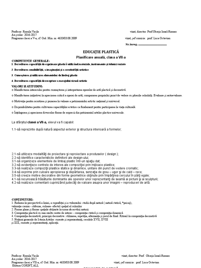 Planificare Educație Plastică Clasa A Vii A 2019 2020 Mercurius 14 09 2019