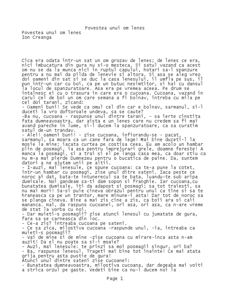 Povesti De Ion Creanga Povestea Unui Om Lenes Neamt Online