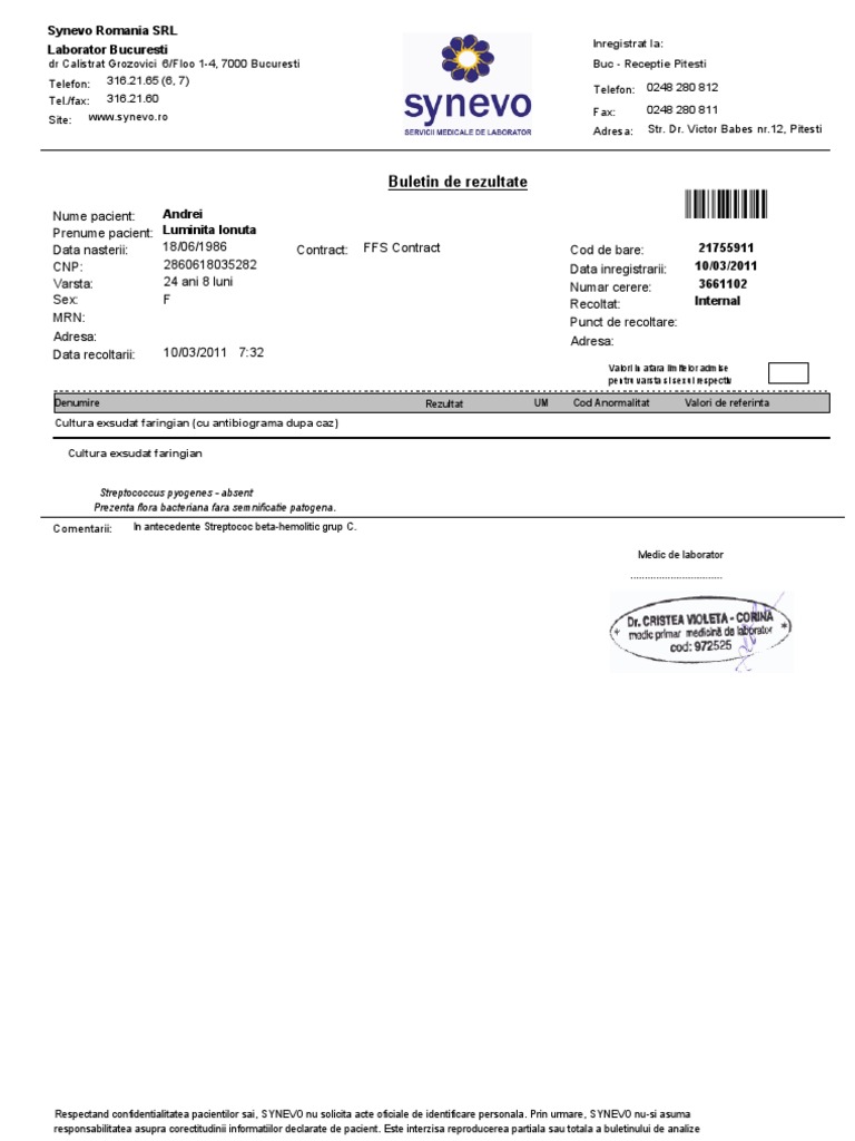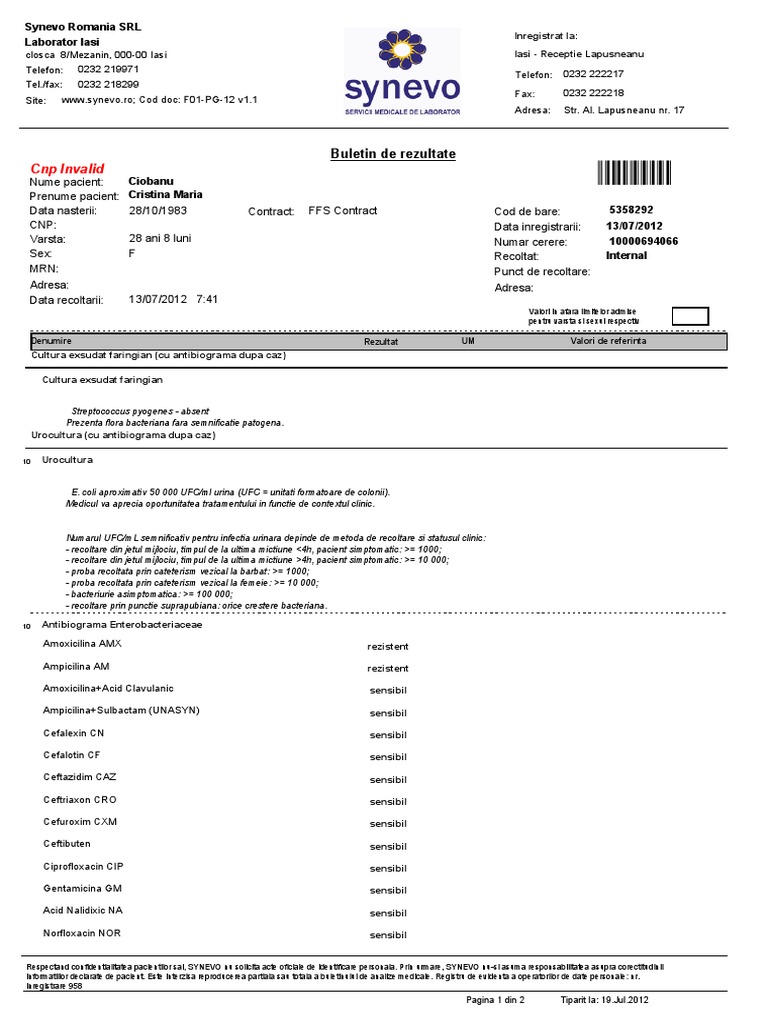 Cultură Secreție Col Uterin Cu Antibiogramă După Caz Synevo