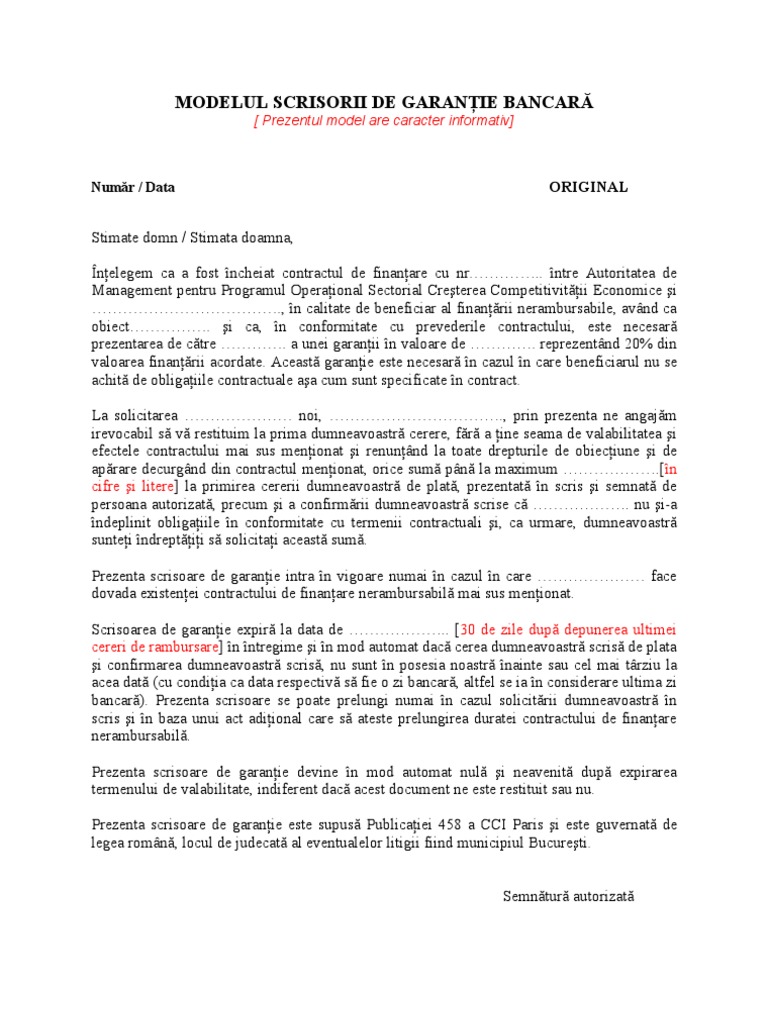 Modelul Scrisorii De Garantie Bancara
